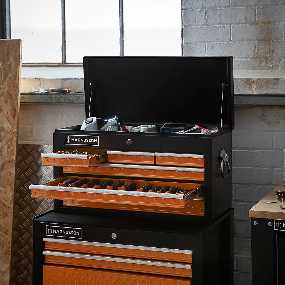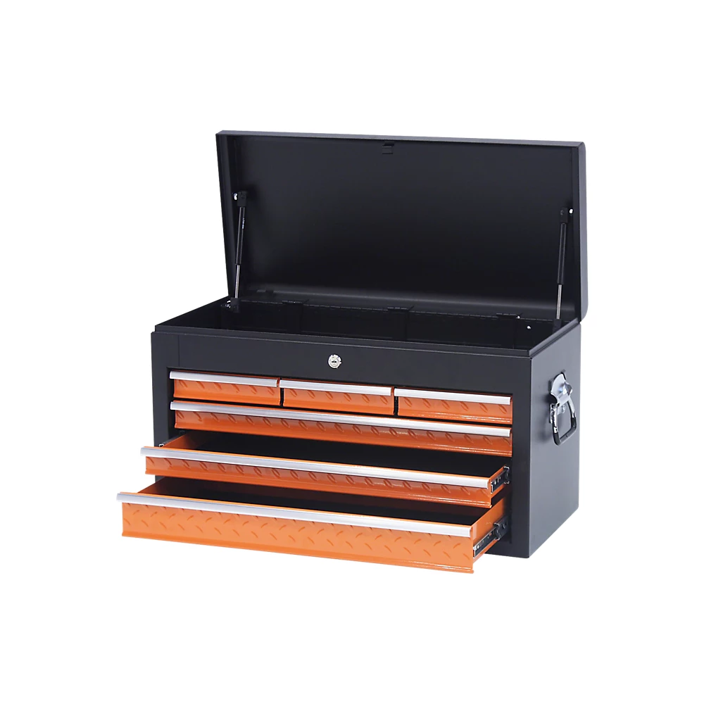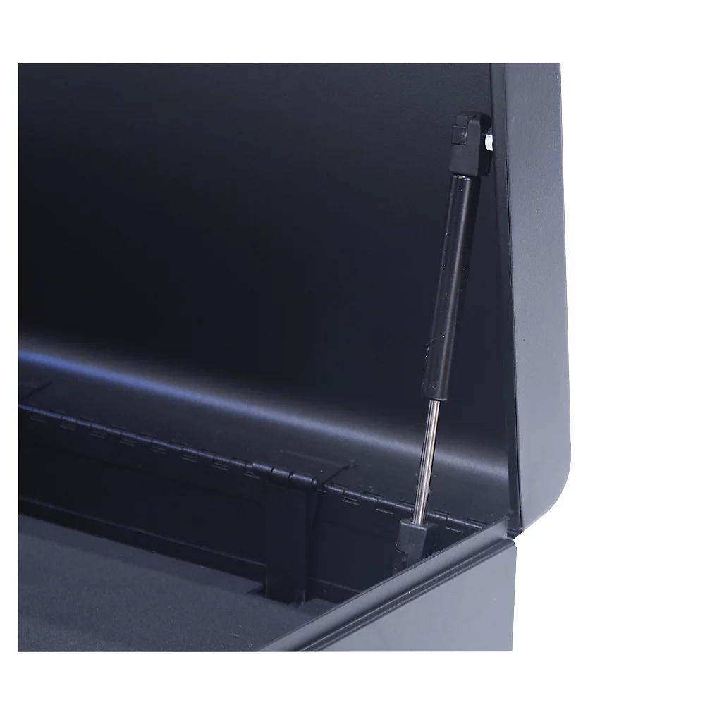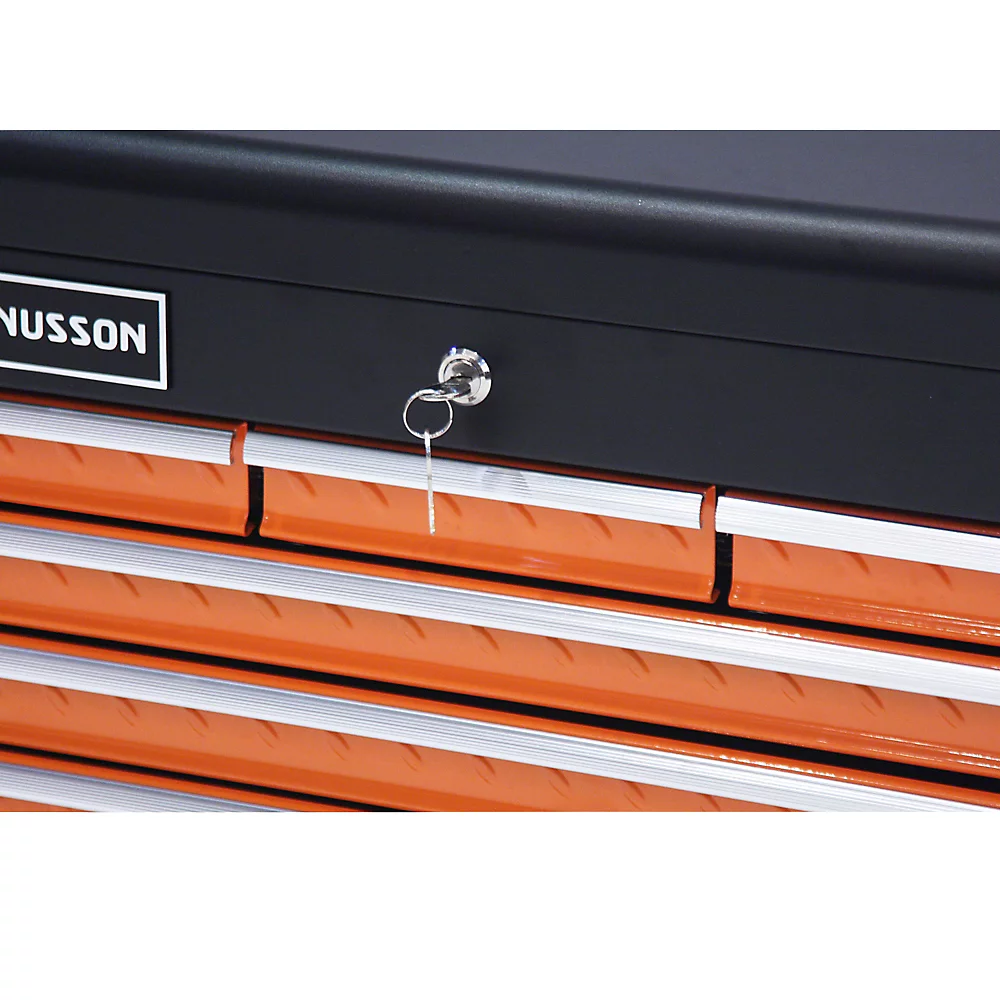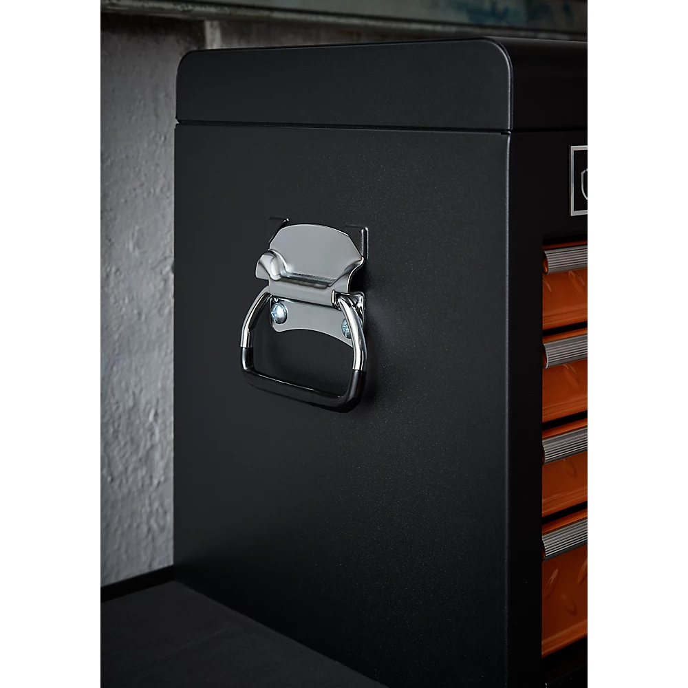 Avec revêtement par poudre pour une protection plus durable Les vérins à gaz permettent au couvercle de rester ouvert en toute sécurité et de se refermer doucement. Les tiroirs sont équipés de poignées de pleine largeur et sont verrouillables, contribuant ainsi à sécuriser vos outils. 2 clés fournies.