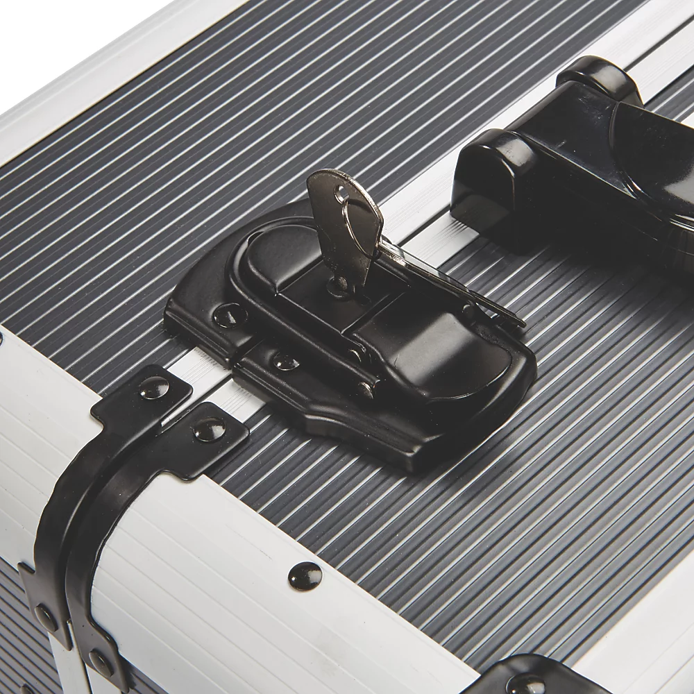 Mallette à organiseur avec 4 plateaux en porte-à-faux et plusieurs compartiments. Doté de loquets en métal, d’angles en métal et d’une bandoulière. Idéale pour ranger des outils et des accessoires.