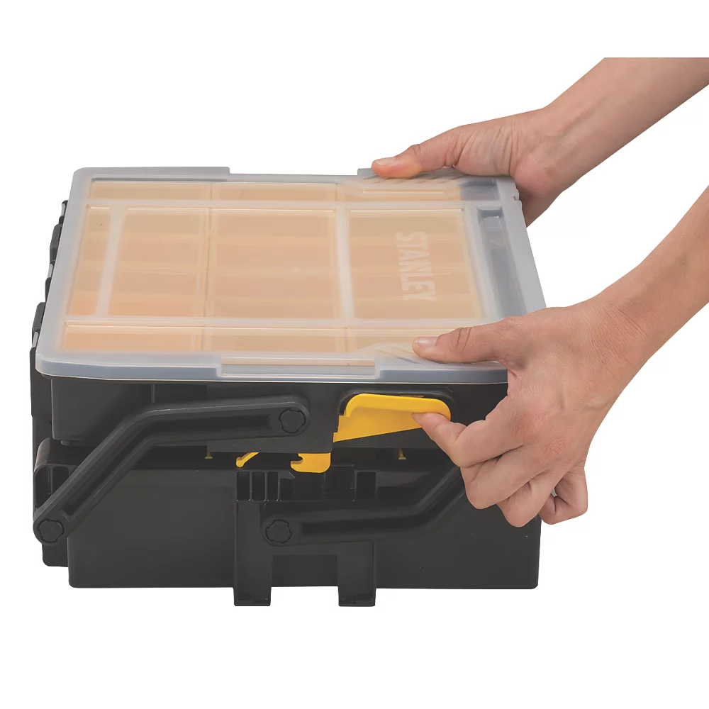 Organiseur polyvalent conçu pour offrir une solution flexible pour le stockage d’outils, d’accessoires, de petites pièces et de fixations. Le rangement peut être personnalisé grâce à une combinaison de caches et de séparations amovibles. Conçu avec une poignée de transport dans une configuration de valise pour optimiser l’espace de rangement. Avec un couvercle transparent permettant de voir le contenu, qui s’ouvre en se soulevant pour permettre l’accès aux deux sections. Peut être connecté à l’organiseur Junior Sortmaster et transportés ensemble.