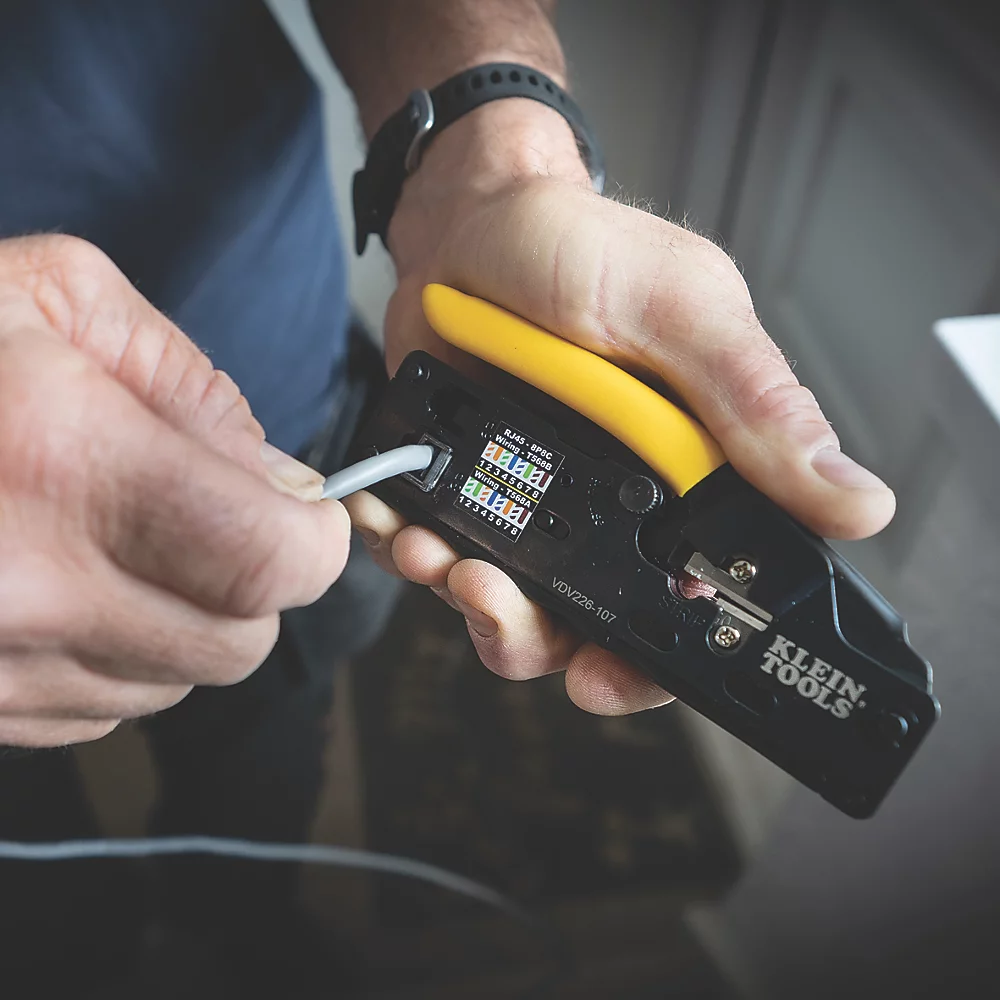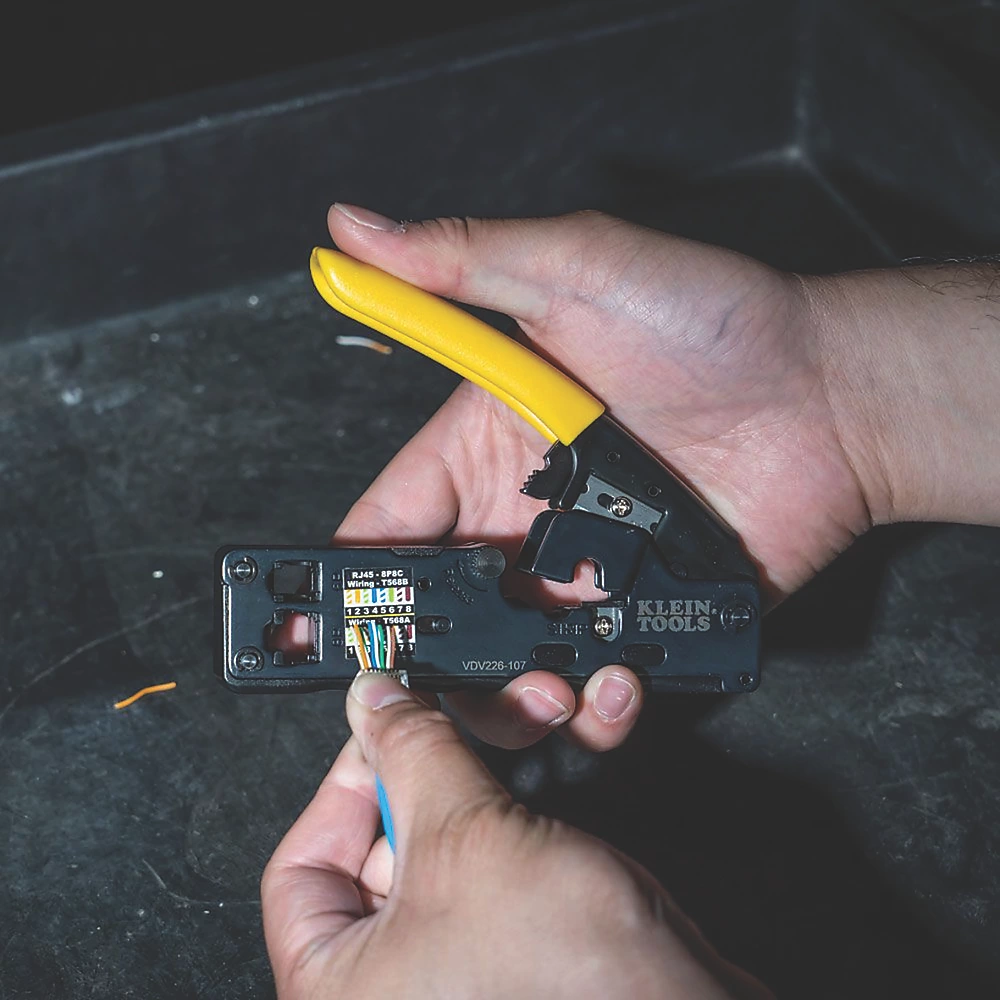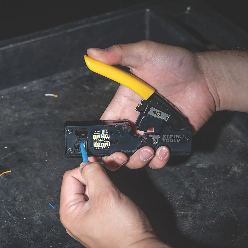 Conception compacte et ergonomique pour une utilisation naturelle d’une seule main et un rangement facile. Le cliquet haute résistance garantit un raccordement complèt. L’action de sertissage latéral direct permet un raccordement plus précis et plus uniforme des contacts quelles que soient les broches. Cet outil polyvalent coupe, dénude et sertit les câbles téléphoniques voix et données. Pour couper et dénuder des câbles téléphoniques voix CAT6, CAT5e, CAT3 et plats satinés. Pour sertir des connecteurs modulaires à 6 et 8 positions (RJ11, RJ12, RJ45). Schémas de câblage des connecteurs de référence fournis sur l’outil et téléchargeables sur un appareil mobile.