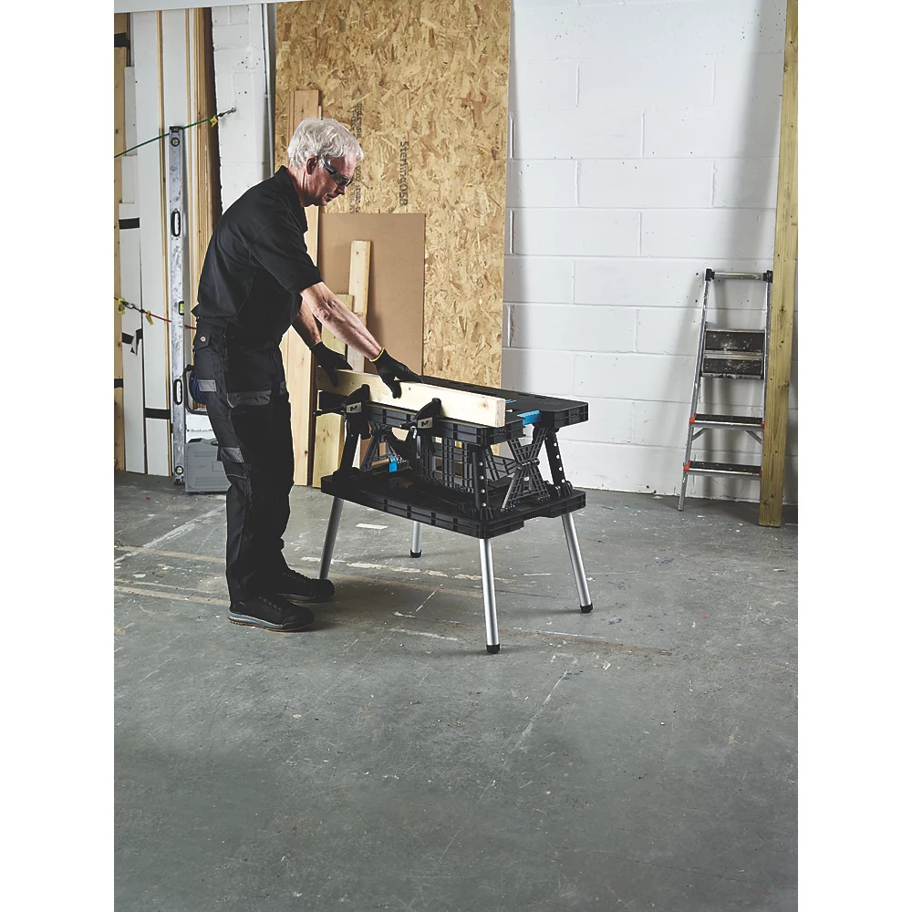 Poste de travail pliable portable avec système d’ouverture rapide. Doté d’une grande surface de travail et livré avec 2 serre-joints de 30cm.