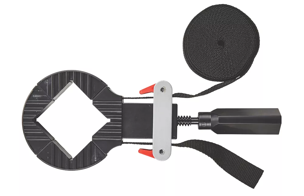 Presse à ruban réglable avec 4 mors de serrage en plastique et une bande résistante à l’usure. Les mors peuvent être retirés pour le serrage d’objets cylindriques.