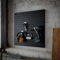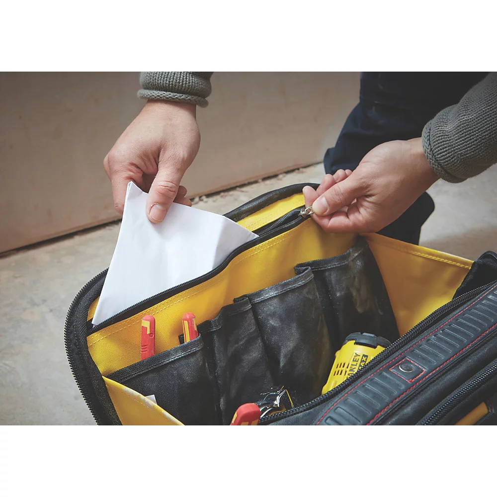 17″ (430mm). Sacoche à outils robuste avec compartiments de rangement à double ouverture offrant une organisation et une visibilité des outils excellentes. Plusieurs poches espacées sur les deux côtés, pour les outils électriques et les outils à main. La base en plastique protège de l’eau.